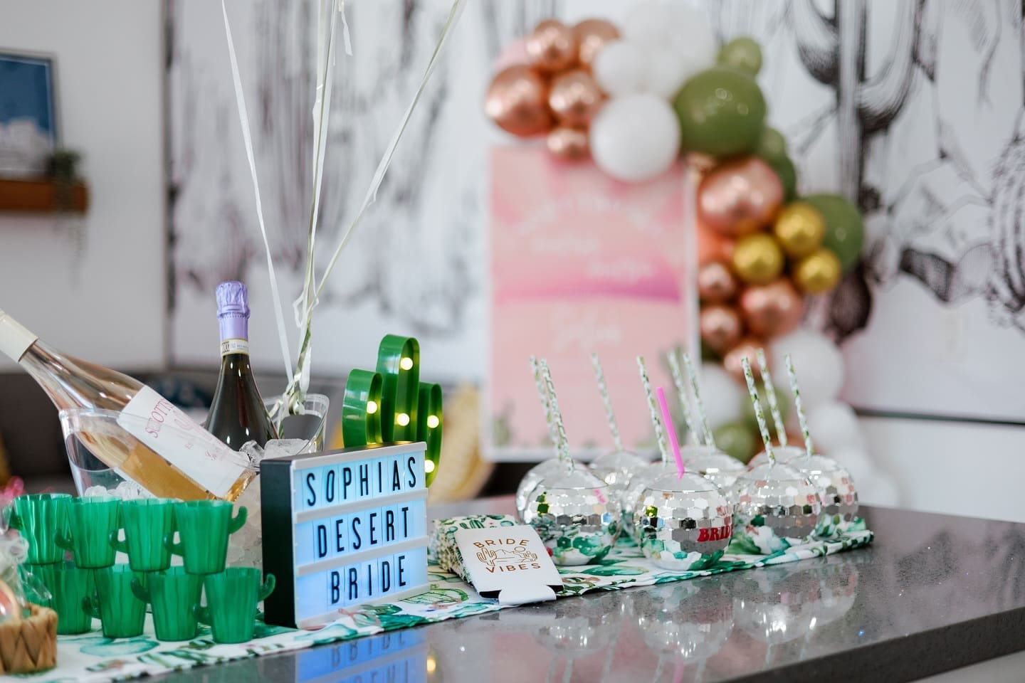 PLUS, you'll get everything in our BASIC package: - 8'x7' Photo backdrop with balloon garland - Bride room decor- 8X10 welcome sign-Themed rented cups or koozies